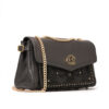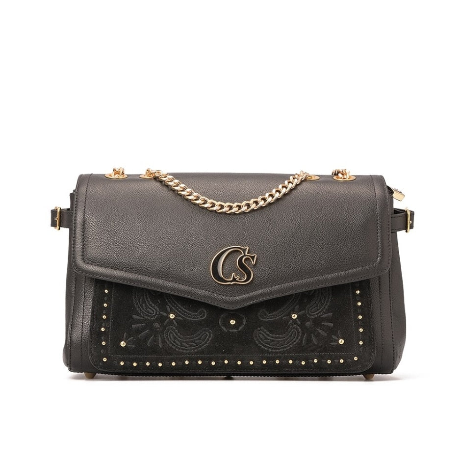 Com visual marcante e cheio de identidade, esta bolsa média traz bolso frontal com bordado e aplicação de metais, criando um contraste interessante entre o clássico e o urbano. A alça de corrente dourada permite diferentes formas de uso – no ombro ou como tiracolo, garantindo praticidade no dia a dia. Na parte interna, o bolso com fechamento em zíper ajuda a manter tudo no lugar. Um modelo que equilibra funcionalidade e estilo com personalidade.