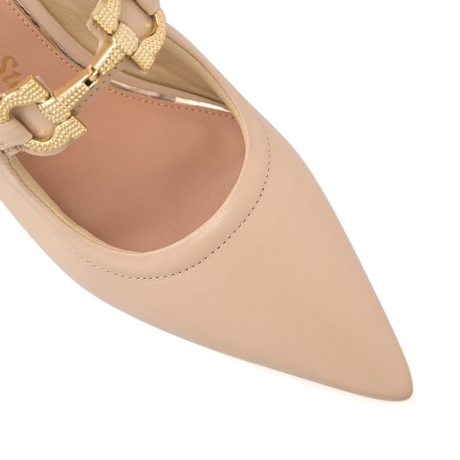 Mule em couro com detalhe de bridão dourado: Elegância e Versatilidade Confeccionado em couro legítimo, este mule combina sofisticação e conforto, sendo perfeito para compor produções elegantes e modernas. O modelo se destaca pela aplicação de bridão com banho ouro, que adiciona um toque de requinte e exclusividade ao design. Versátil, esse mule é ideal para ocasiões casuais ou formais, sendo uma peça indispensável para quem busca praticidade sem abrir mão do estilo refinado.