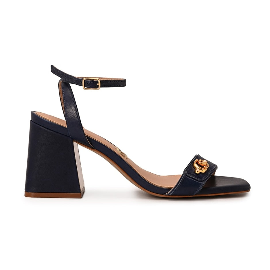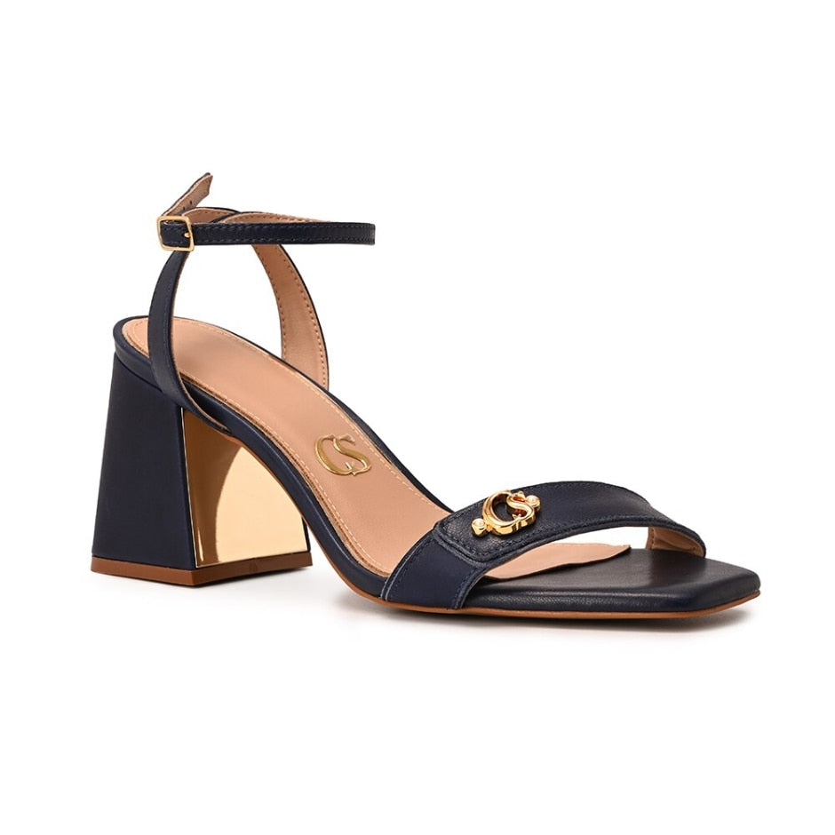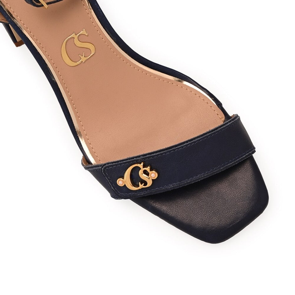 Sandália de bico quadrado e salto bloco cromado confeccionada em couro legítimo na cor azul marinho. O modelo traz uma tira média que passa sobre os dedos e outra que envolve o tornozelo, com fechamento por fivela. Em uma das tiras, conta com metal CS e, na outra, uma pérola personalizada com o logo CS.