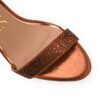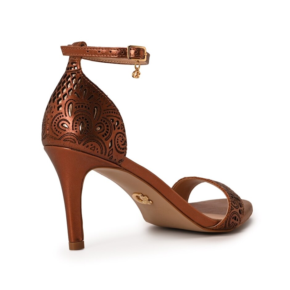 Sandália de bico redondo e salto fino feita em couro legítimo na cor cobre. O modelo conta com desenhos e recortes vazados a laser na tira que passa sobre os dedos e no traseiro fechado. O fechamento é por fivela com pingente personalizado.