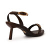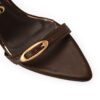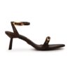 Sandália de bico fino e salto geométrico confeccionada em couro legítimo na cor marrom madeira. Com linhas modernas, o modelo conta com tiras finas com fivelas personalizadas.