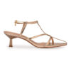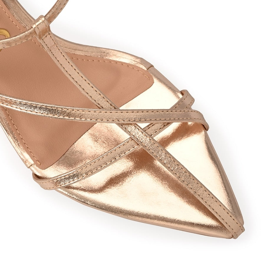 Sandália de bico folha com tiras finas confeccionada em couro legítimo na cor dourada. Com design moderno, o modelo apresenta salto kitten heel, trend forte das últimas temporadas, e tira frontal.
