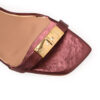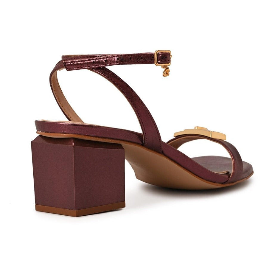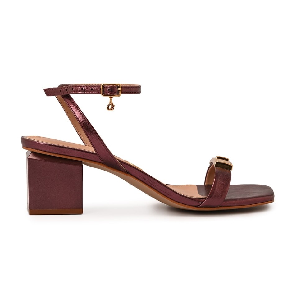 Sandália de bico quadrado e salto bloco geométrico confeccionada em couro legítimo na cor marsala. O modelo conta com uma tira média que passa sobre os dedos e outra que envolve o tornozelo, com fechamento por fivela. Na tira principal, possui placa fecho personalizada CS.
