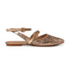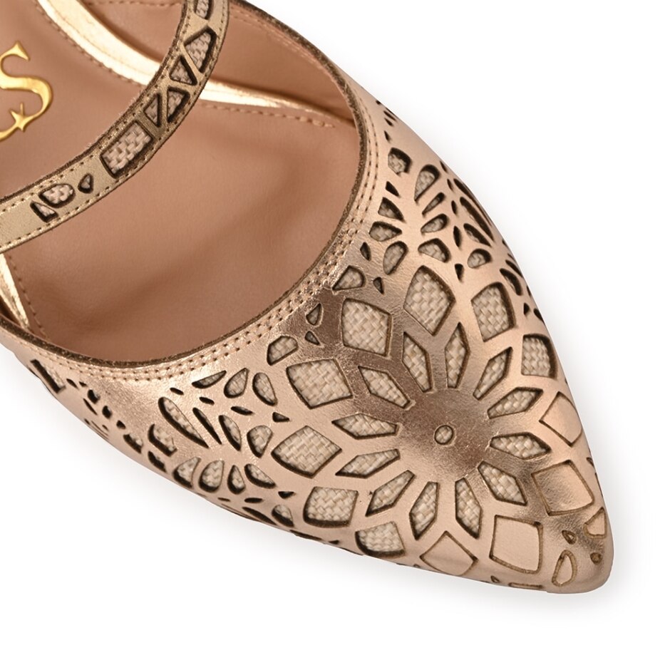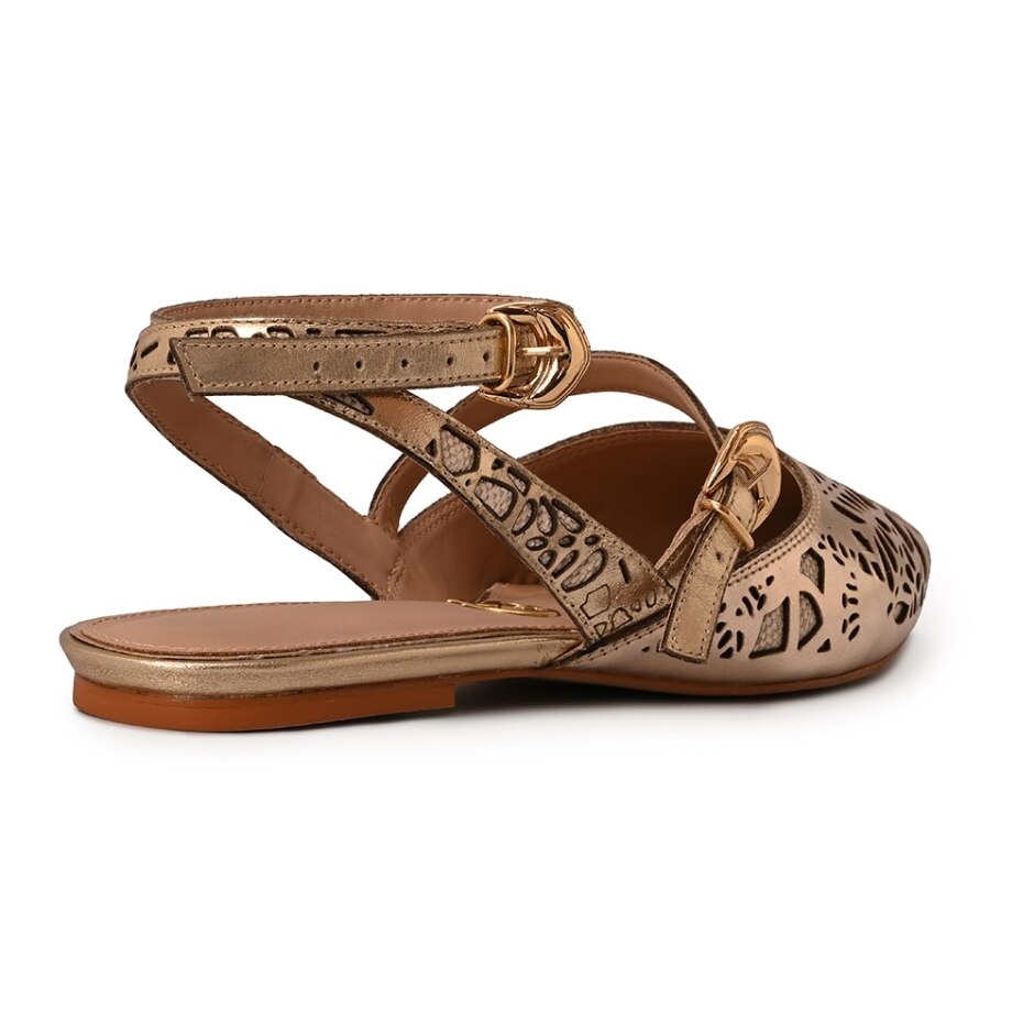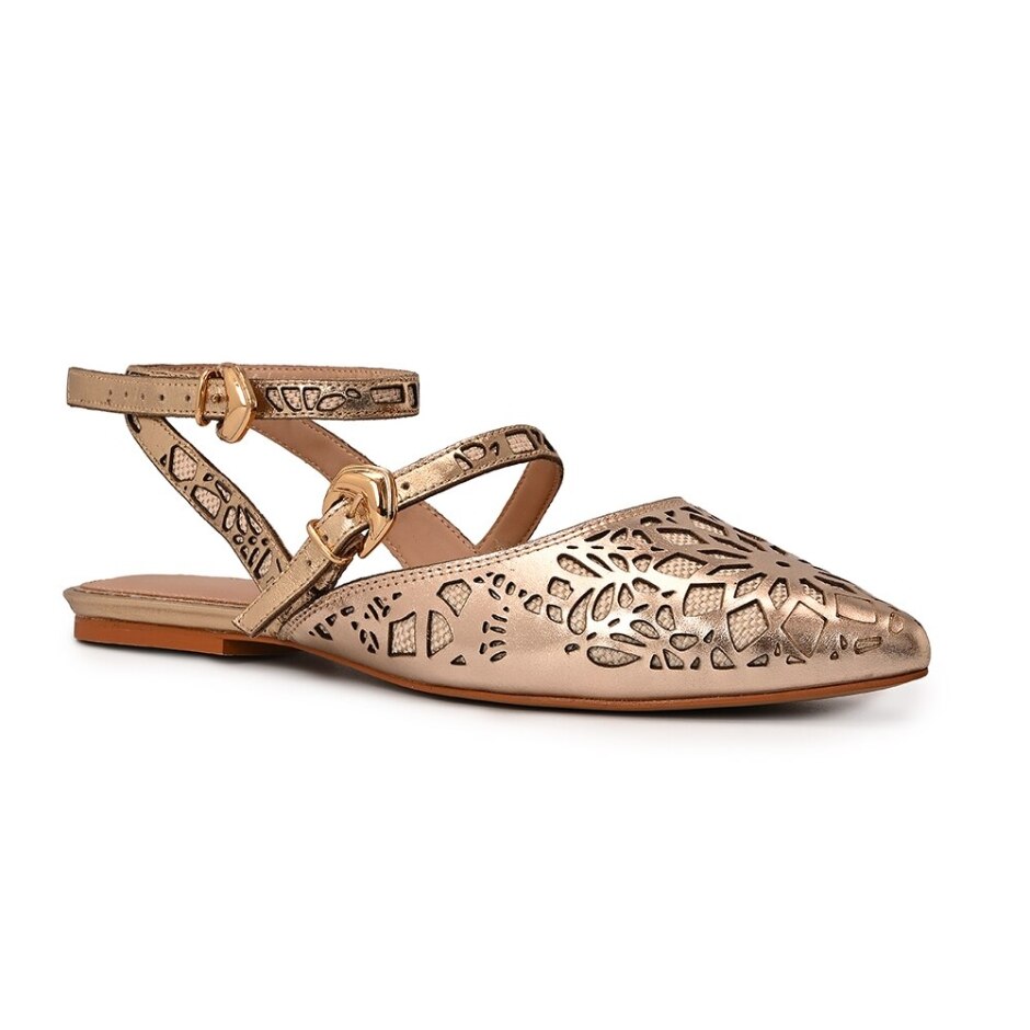 Sapatilha confeccionado em couro legítimo na cor dourada gold. Com bico fino, o modelo possui recortes e desenhos vazados feitos a laser e duas tiras com fechamento por fivela.