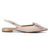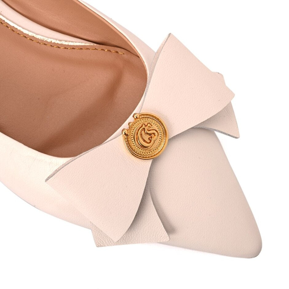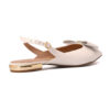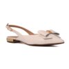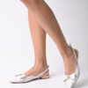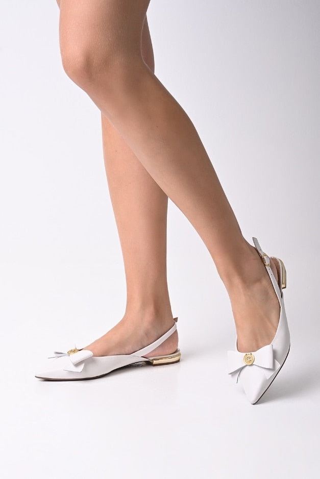 Sapatilha tipo slingback de bico fino feita em couro na cor bianco. Com salto cromado, o modelo traz um laço no cabedal com detalhe de metal personalizado CS.