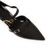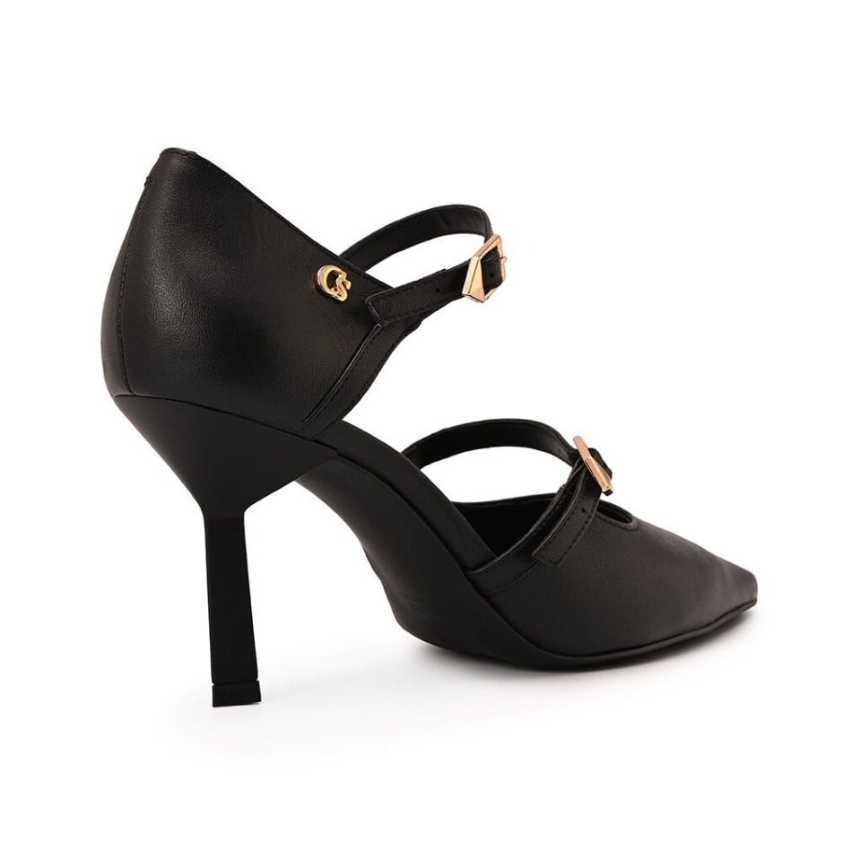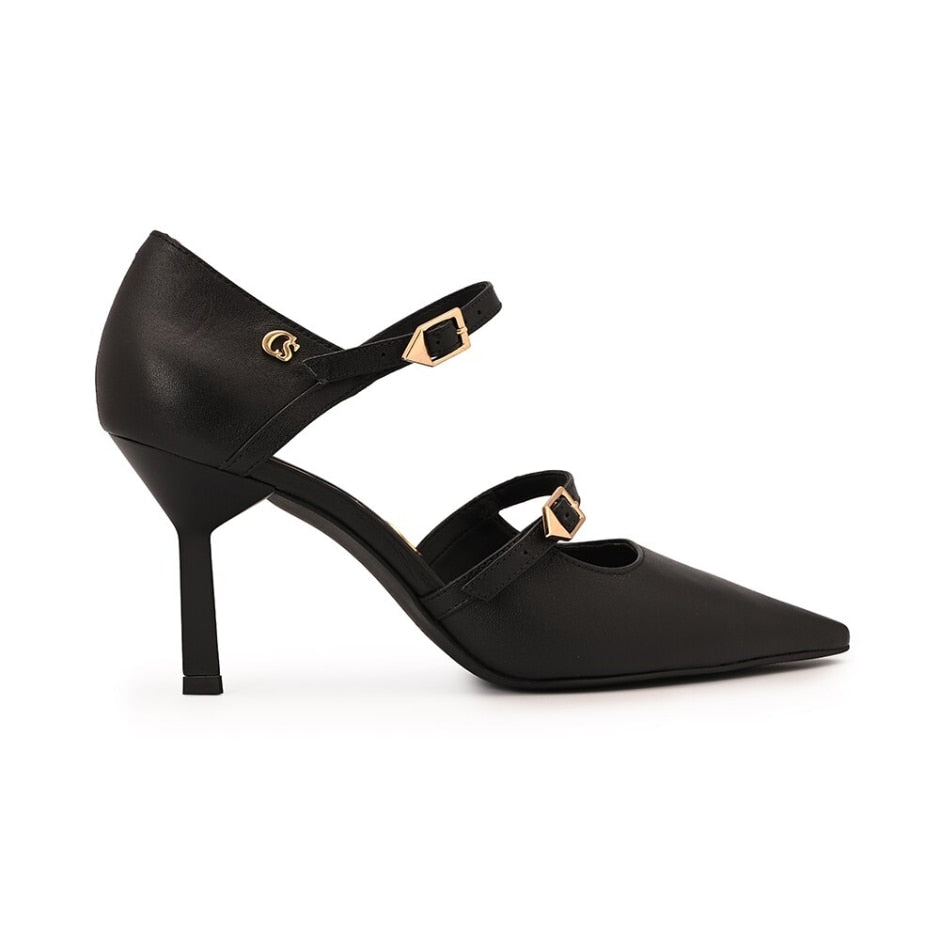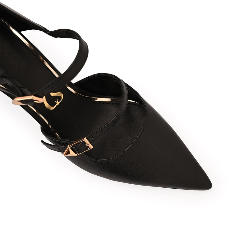 Scarpin de bico fino alongado confeccionado em couro legítimo na cor preta. O modelo conta com fivelas com detalhes geométricos, que acompanham o salto.