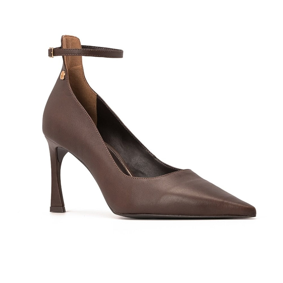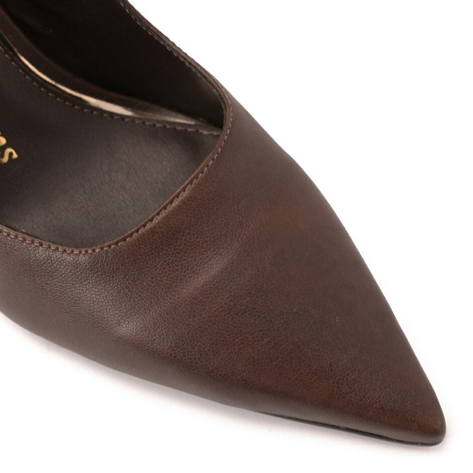 Scarpin em Couro Marrom com Salto Vírgula e Detalhes Dourados