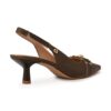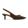 Scarpin slingback de bico fino alongado confeccionado em couro legítimo na cor verde musgo. O modelo conta com uma tira delicada com aplicação de metais no cabedal e fecho com velcro para facilitar o ajuste.