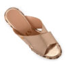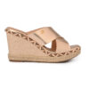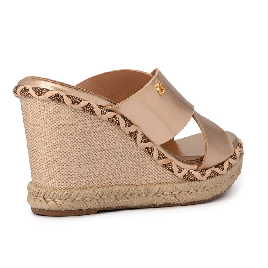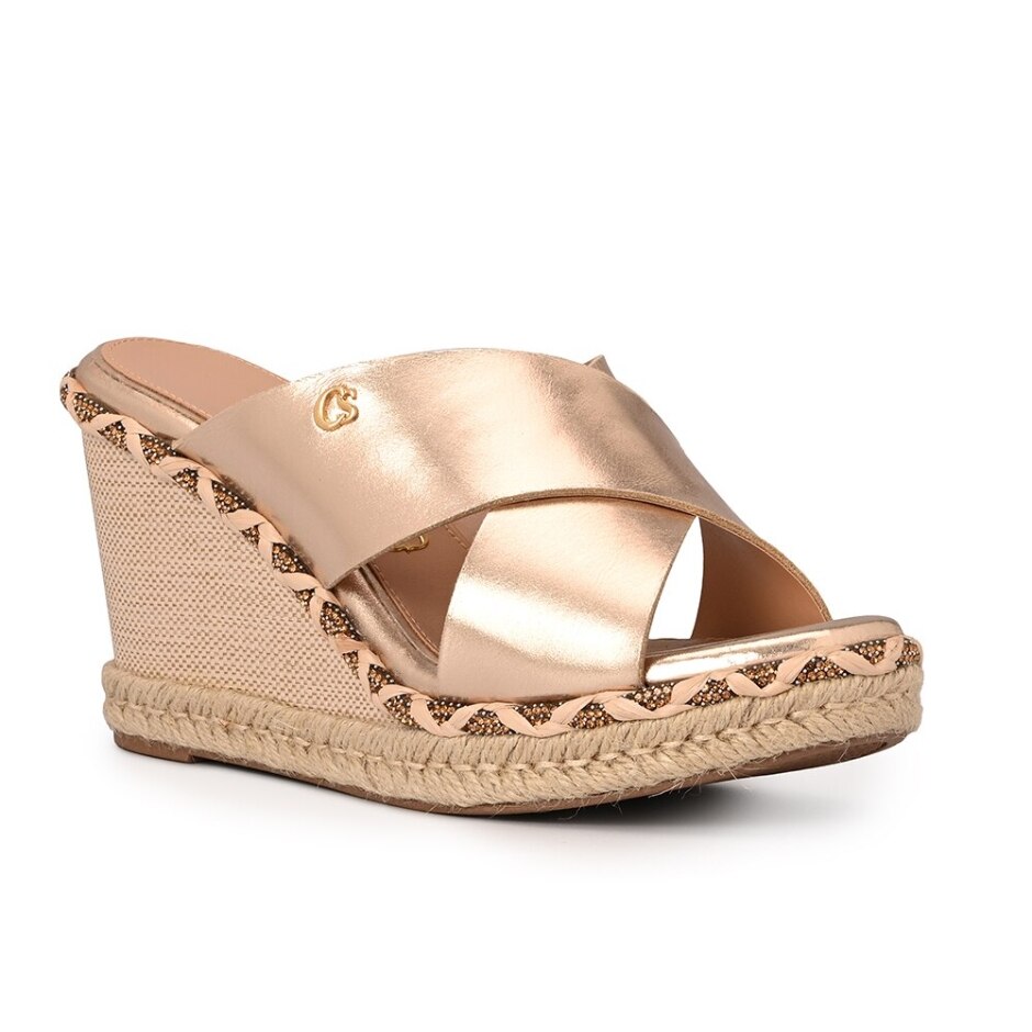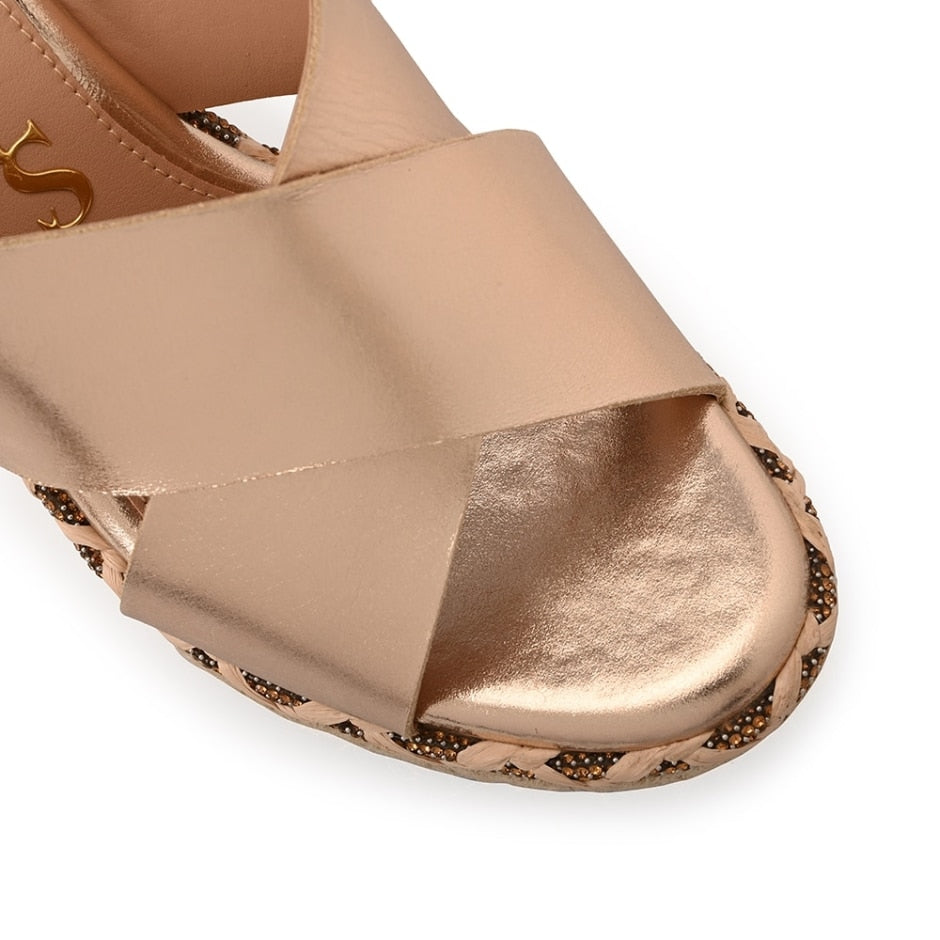 Tamanco anabela confeccionado em couro legítimo na cor dourada. Com tiras grossas que se cruzam sobre o pé, o modelo possui aplicação de palha, corda, ráfia e cristais em sua plataforma.